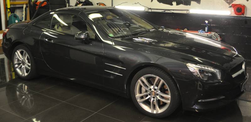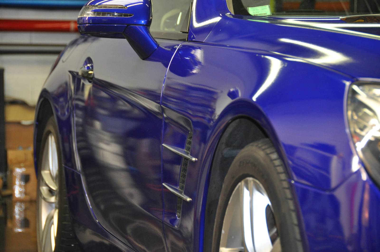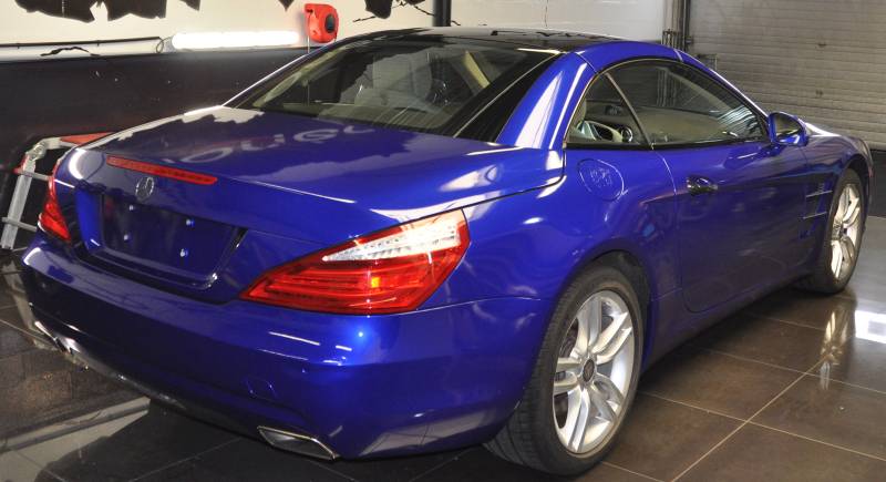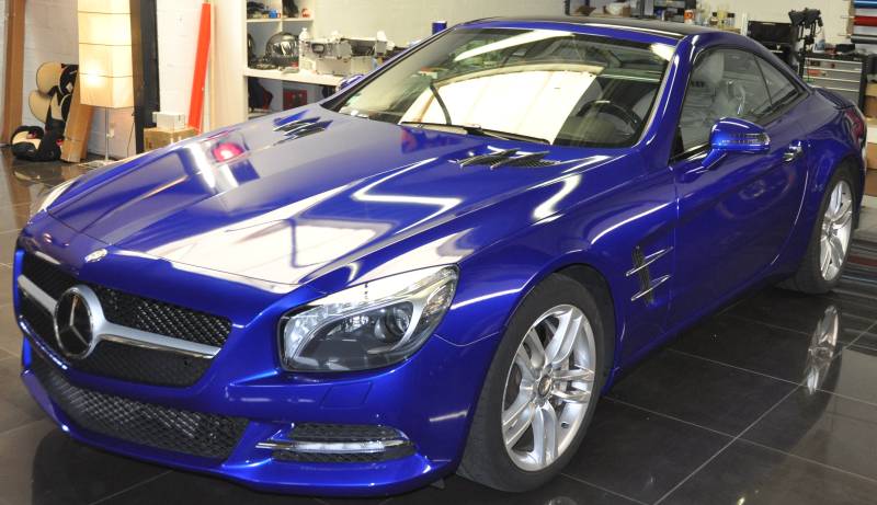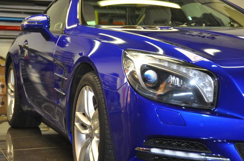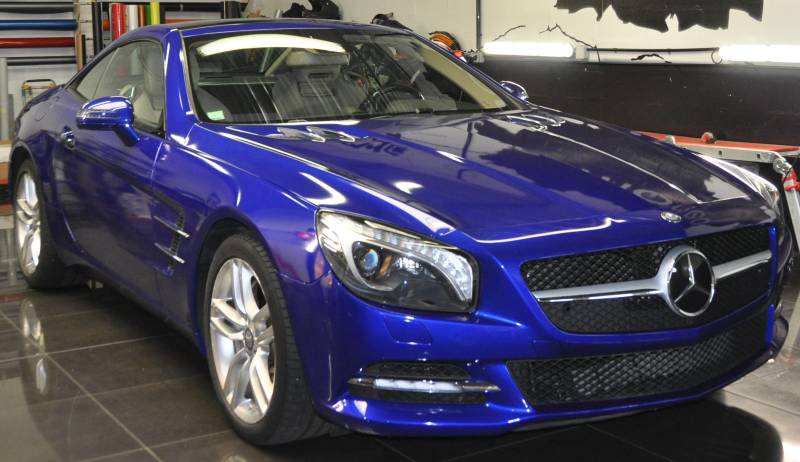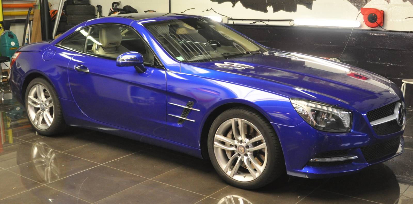 Le choix d’un bleu vibrant apporte une personnalité unique à cette voiture de luxe, attirant tous les regards sur la route. Chaque détail a été soigneusement travaillé pour garantir une finition impeccable, mettant en valeur la silhouette élégante de la 500 SL.