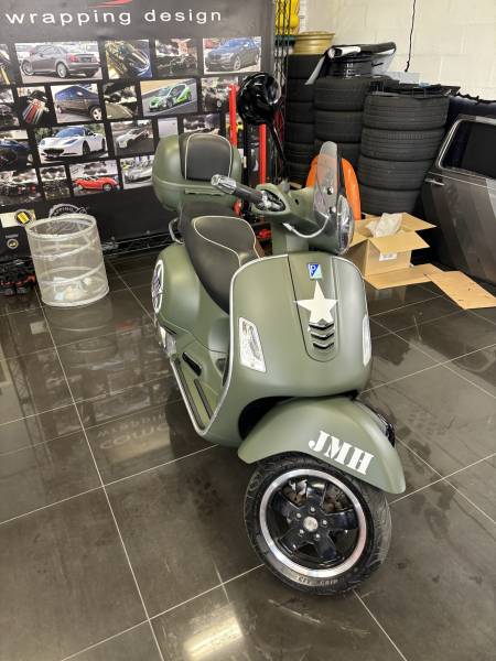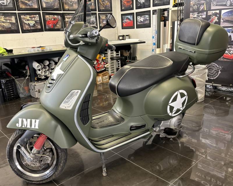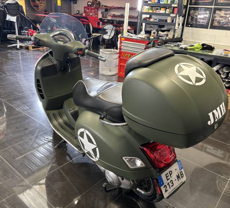 Pour apporter une touche finale unique, nous avons ajouté des découpes blanches demandé par le client, mettant en avant les logos de l'armée américaine. Ce détail distinctif crée un contraste saisissant et renforce le caractère militaire de la personnalisation design, faisant de cette Vespa un véritable objet de collection.
