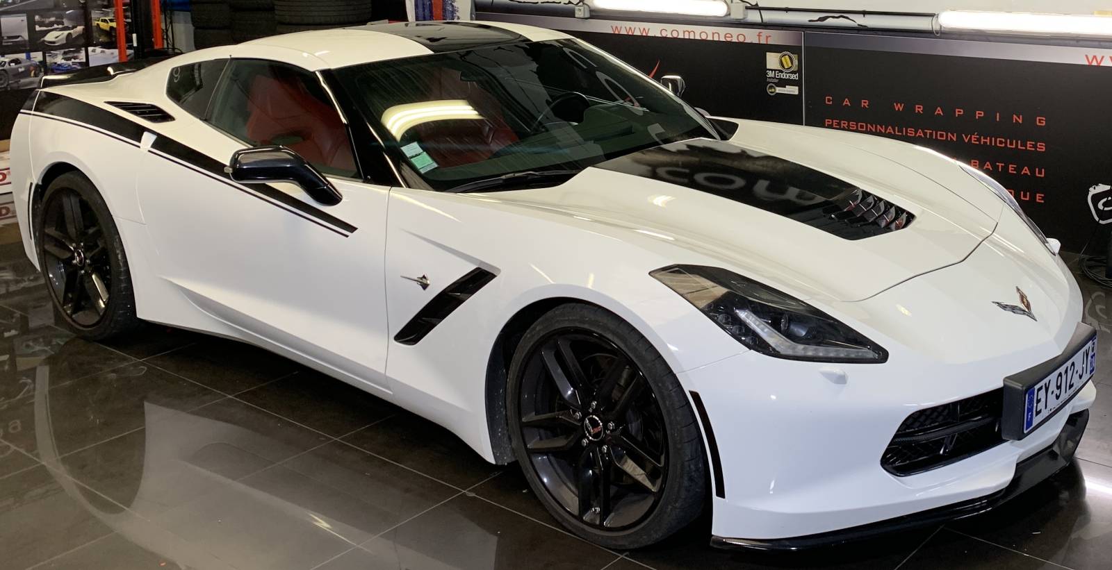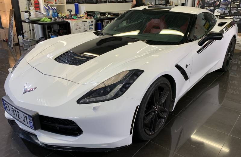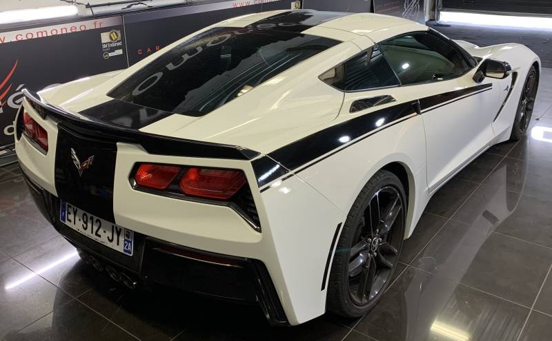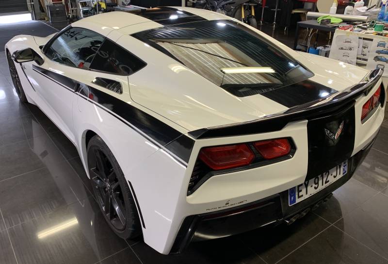 Nous avons appliqué deux bandes noires élégantes qui s'étendent le long des côtes latérales de la voiture, créant un effet dynamique et accrocheur. Ces bandes se poursuivent également sur l'entrée d'air du capot avant, ajoutant une continuité visuelle qui souligne les lignes fluides de la Corvette. Pour parfaire le look, les bandes noires se prolongent jusqu'au pare-chocs arrière, offrant une finition harmonieuse et cohérente.