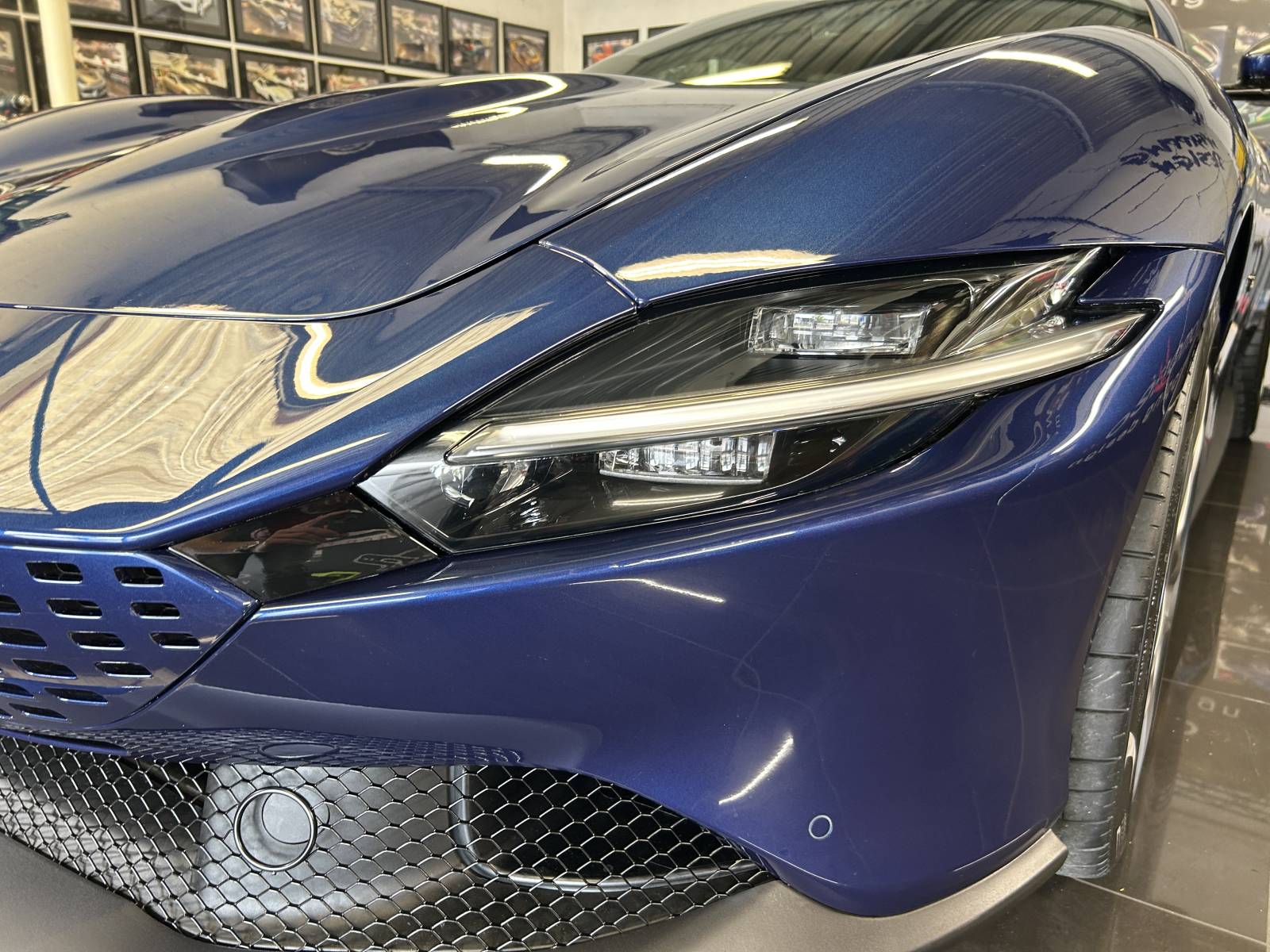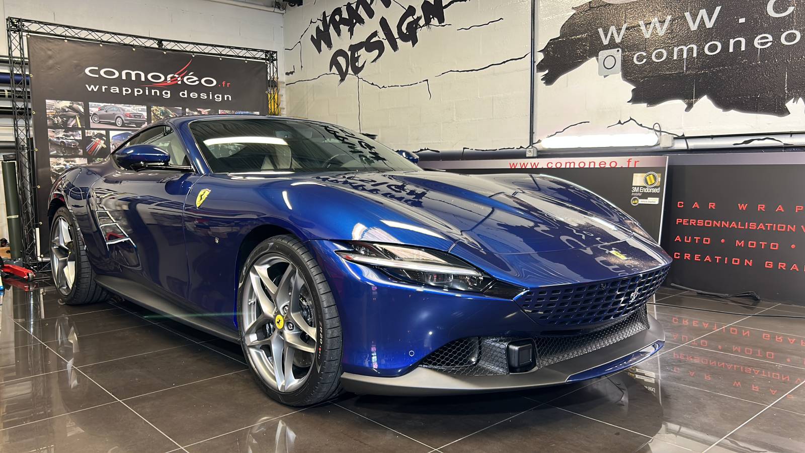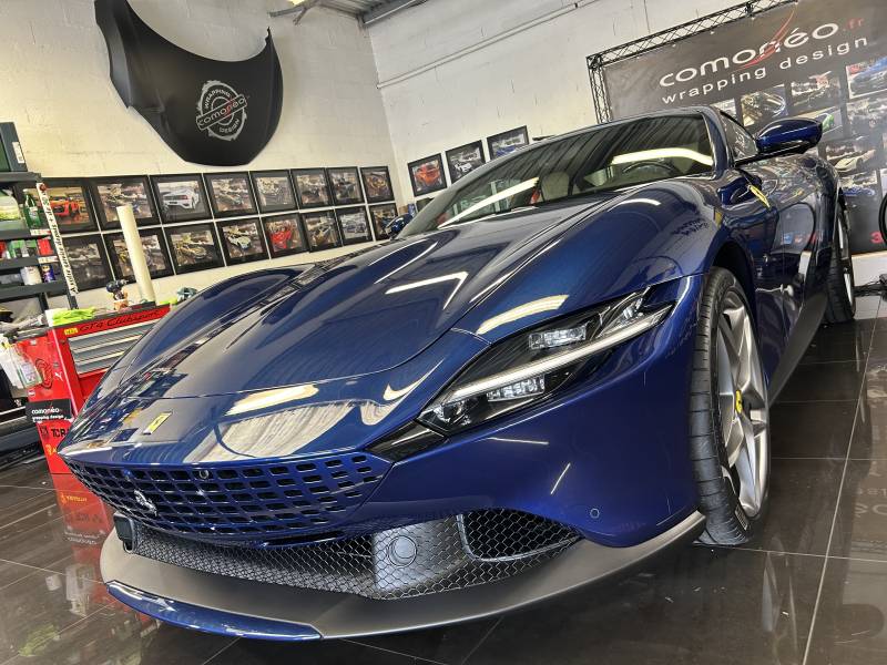 Pour protéger la peinture de cette Ferrari Roma flambant neuve, L'équipe de Comonéo a appliqué un film de protection transparent.